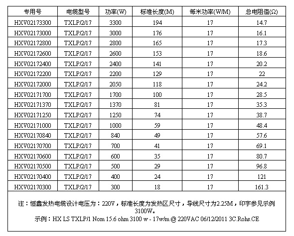 1、芯線:金屬合金絲;芯線為具有正電阻溫度係數的組成,線性額定功率為17w/m。